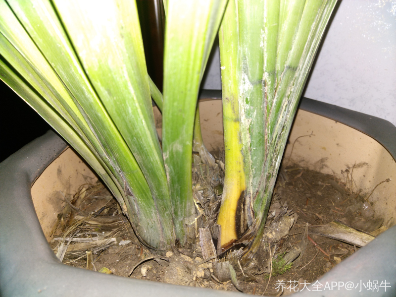 去年年底前买回来就是这样白白的,当时不懂,这一段时间有叶子开始从根部发黄,扒开看看就这样黄的黑的