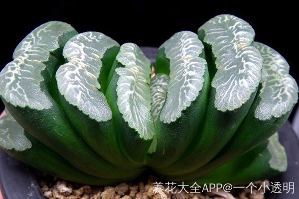玉扇又名截形十二卷,属于百合科十二卷属的多肉植物、也称多浆植物,植株无茎,肉质叶排成两列呈扇形,叶片直立,稍向内弯,顶部略凹陷。表面粗糙,绿色至暗绿褐色,有小疣状突起,新叶的截面部分透明,呈灰白色。